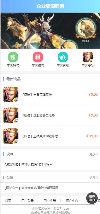 没有太多的华丽介绍,页面简单实用,程序适用于自营王者荣耀代练,账号交易,皮肤交易 支付对接易支付程序短信对接阿里云