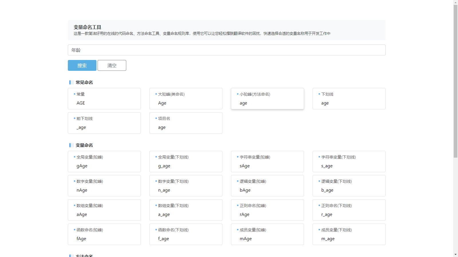 软件开发过程中,命名是一个非常重要的环节。一个良好的命名规范可以使代码更易读、易理解, 并且有助于团队成员之间的协作。然而,对于非英语母语的开发者来说,翻译命名常常是一项困扰。 为了解决这个问题,我们推出了一款简洁而好用的在线代码命名工具。 它不仅可以帮助开发者摆脱翻译软件的纠结,还提供了丰富的命名规则库, 方便开发者快速选择适合的变量名称用于开发工作中。 使用源码介绍非常简单方便。只需输入需要命名的中文内容,比如常量、类名、方法名等, 然后搜索相应的命名规则即可。我们提供了常用的命名规则,包括大驼峰命名(适用于类名)、 小驼峰命名(适用于方法名)、下划线命名等等。此外, 还包括了一些特殊的命名规则,如前下划线命名、项目名命名等,以供开发者选择。