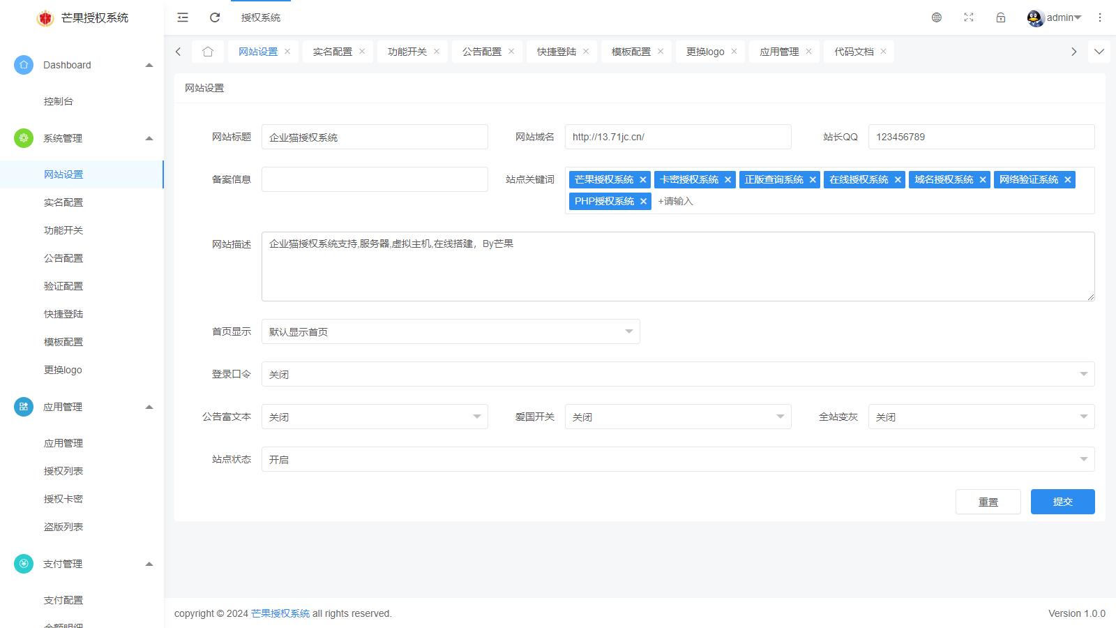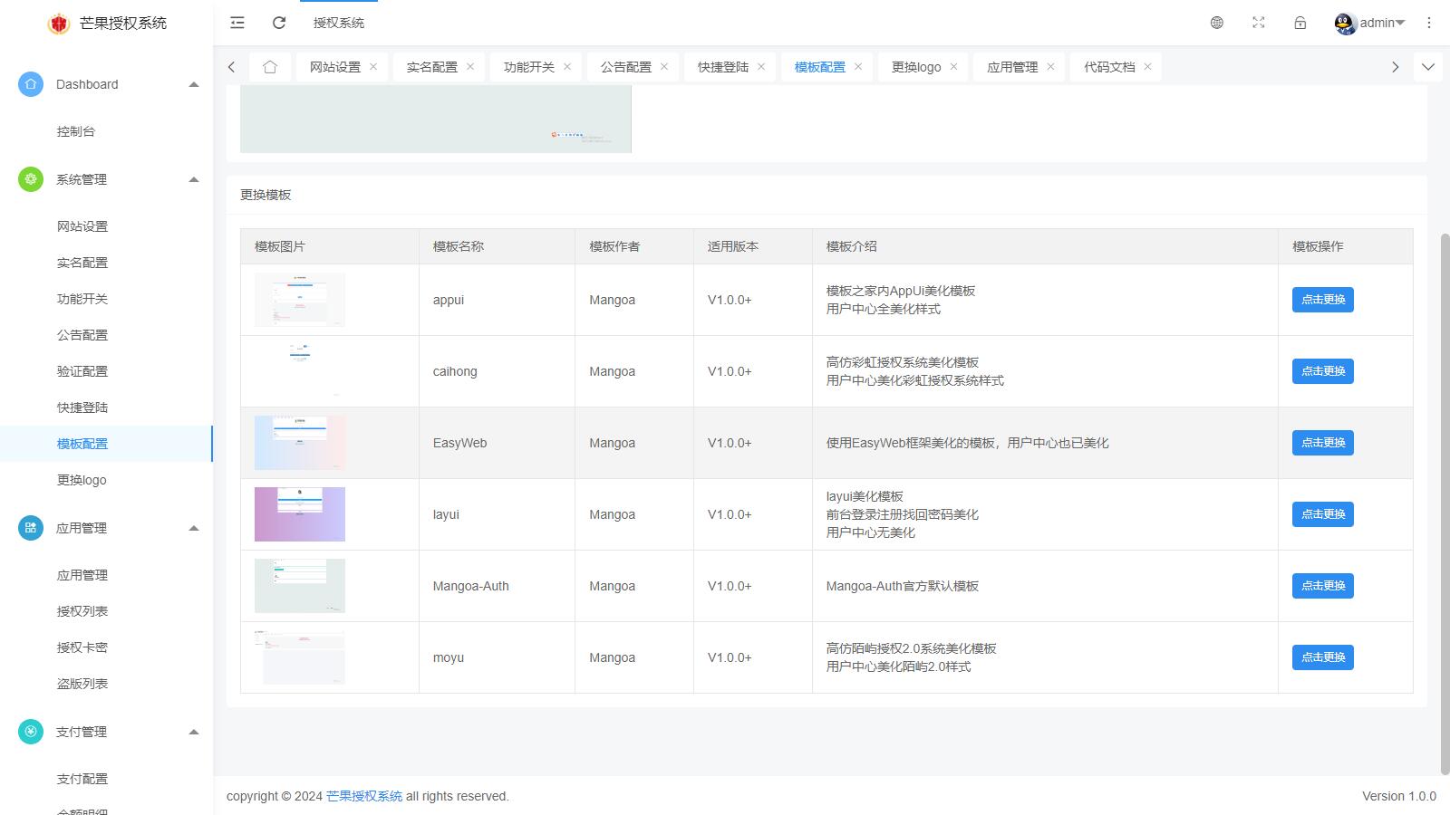8/15会员反馈后企业猫测试发现需要授权才能使用,故暂停下载!! Mangoa-Auth/芒果自助多应用企业级授权系统拥有盗版入库、远程更新等功能 Mangoa_Auth多应用授权系统是专门为个人或企业开发者打造的一款自助多应用授权程序, 后端基于PHP原生,前端基于EasyWeb框架,拥有域名授权、秘钥授权、IP授权, 您可以根据您喜欢的方式进行授权验证,其中您还可以关闭授权验证等您想开启的时候随时开启授权验证即可 并且我们集成了独立的用户中心系统,用户可以自助进行注册并且购买授权, 当然,也可以自助更换授权、自助下载源码、自助升级权限等,完全不用人工操作。 1、自定义等级权限 自定义时间套餐 自定义划分应用 2、多应用授权管理 在线加密|解密 授权加密二合一 3、用户自助授权 自助升级权限 系统版本递增更新 4、模板自由选择 卡密在线授权 自助更换授权 5、第三方快捷登录 版本递增更新 盗版入库处理 6、API对接授权 远程输出广告 支付接口认证 7、应用实名检测 用户工单反馈 个人授权导入 8、额度授权 额度划分 额度套餐 应用额度购买 9、[邮件/短信/微信]通知接入 文章发布功能