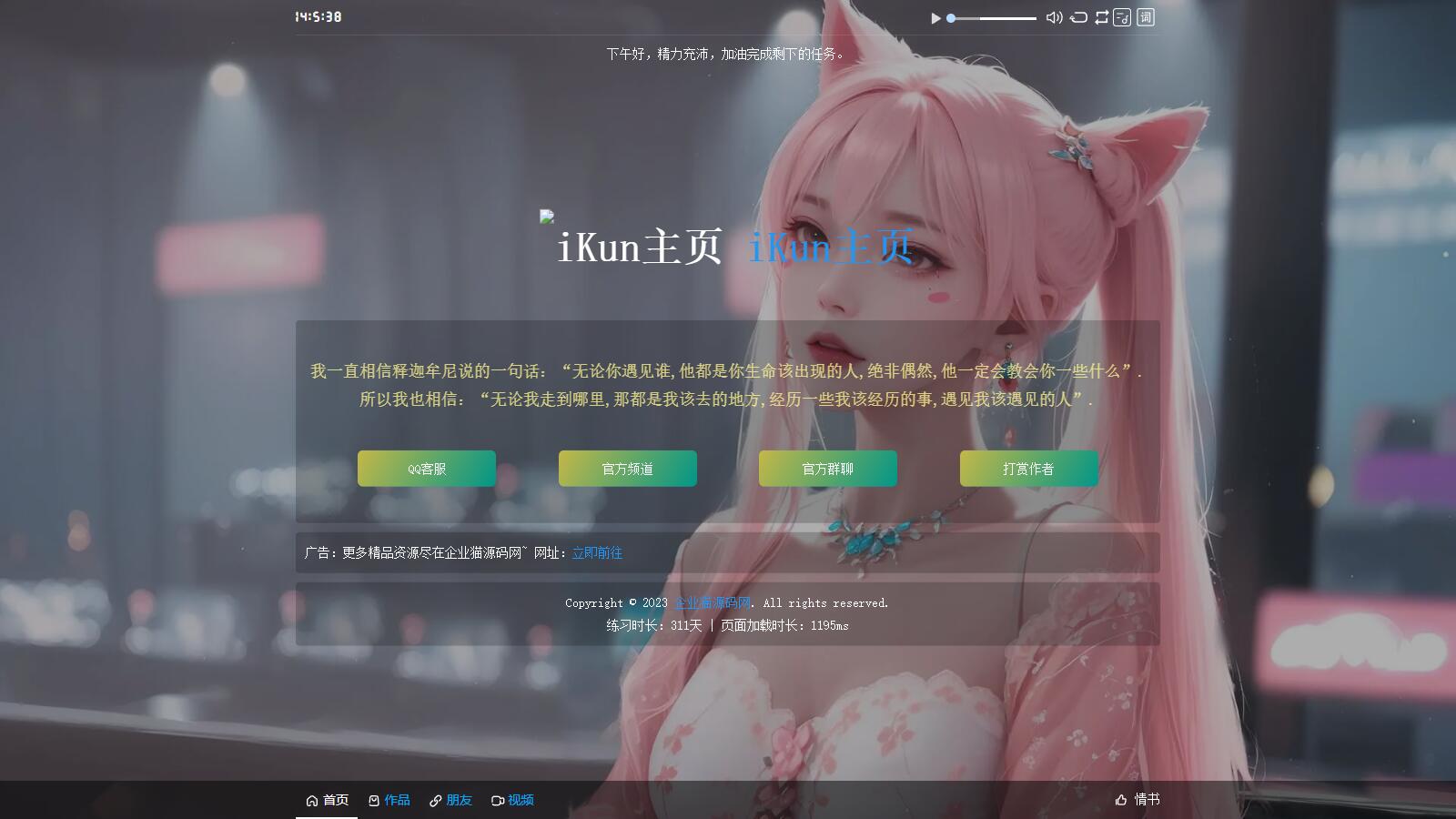 iKun主页 最新2.0版本 无需数据库 带页面音乐版本~ 今天,菜鸟群内小伙伴想要这个主页,给大伙打包出来了,需要的话直接下载吧,无需数据库,没有后台哦!