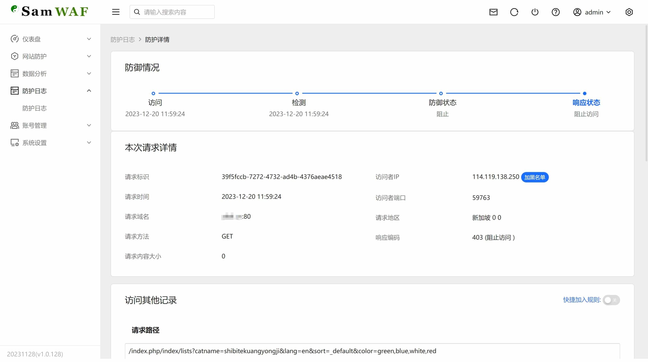 SamWaf网站防火墙是一款适用于小公司、工作室和个人网站的开源轻量级网站防火墙, 完全私有化部署,数据加密且仅保存本地,一键启动,支持Linux,Windows 64位,Arm64。 代码完全开源 支持私有化部署 轻量化不依赖三方服务 完全独立引擎,防护功能不依赖IIS,Nginx 自定义防护规则,支持脚本和界面编辑 支持白名单访问 支持IP黑名单 支持URL白名单 支持限制URL访问 支持指定界面数据隐私输出 支持CC频率访问 支持全局一键配置 支持分网站单独防护策略 日志加密保存 通讯日志加密 信息脱敏保存