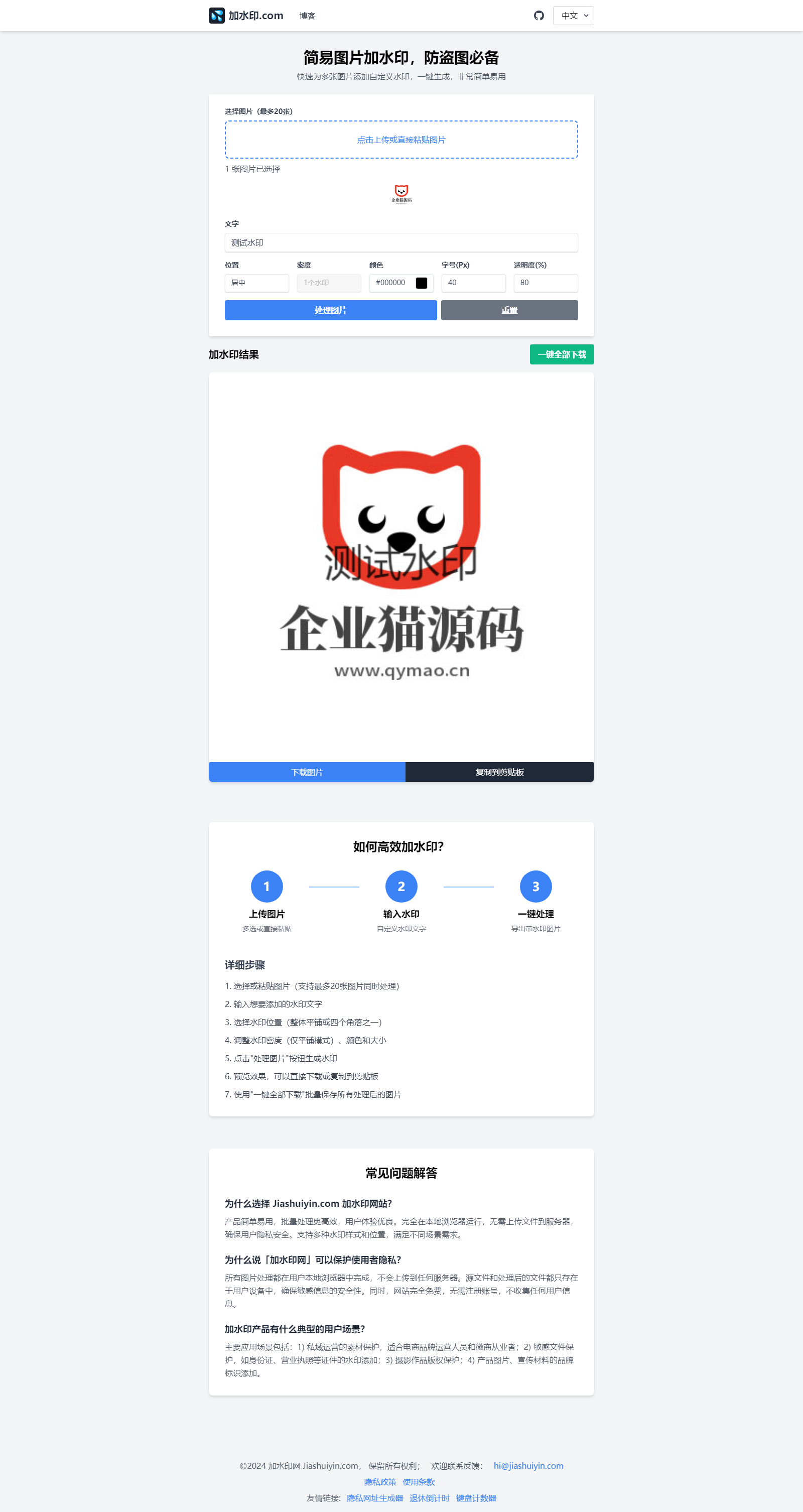 访问 加水印网站 或在本地环境打开 index.html 文件。 通过点击上传区域或直接粘贴来选择需要添加水印的图片(最多20张)。 在 "水印文字" 输入框中输入想要的水印内容。 选择水印位置(整体平铺或四个角落之一)。 如果选择整体平铺,可以调整水印密度。 调整水印颜色、大小和透明度。 点击 "处理图片" 按钮。 在预览区查看处理后的图片,可以点击图片放大预览。 对于每张处理后的图片,您可以选择下载到电脑或直接复制到剪贴板。 点击 "一键全部下载" 按钮保存所有处理后的图片。