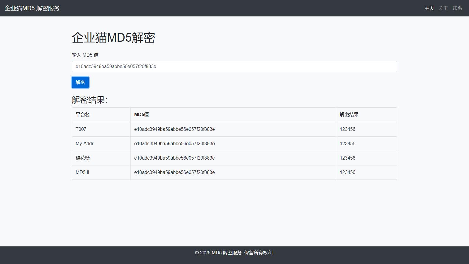 企业猫测试了下,只能解一些常见的md5加密。比较生僻的没解出来。 我使用qymao.cn生成了一个MD5,放到这解了一下,没能解出来