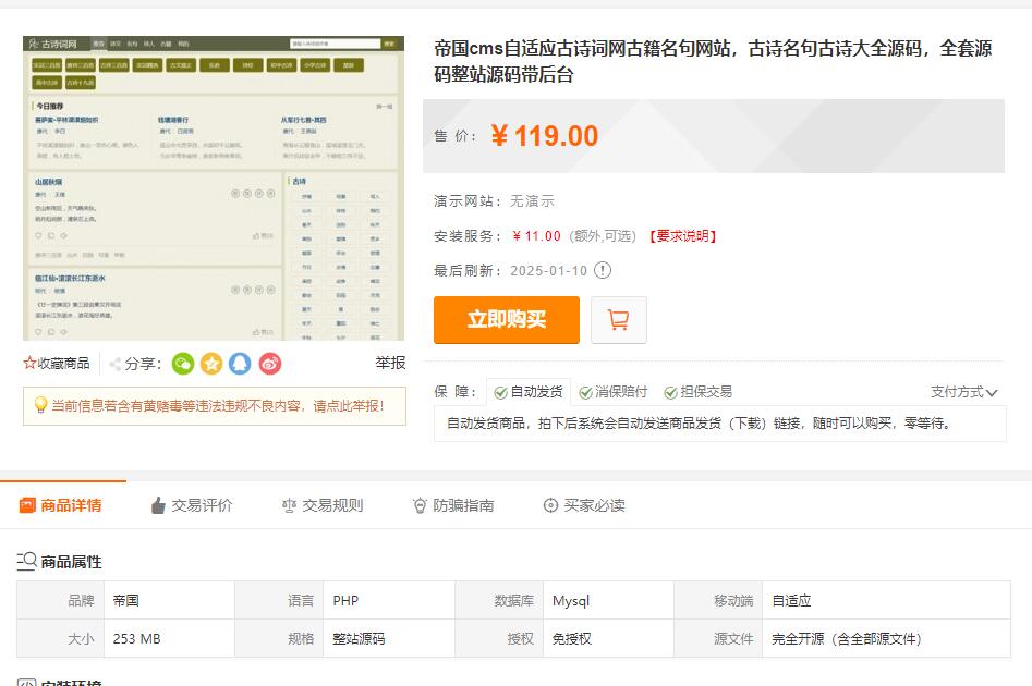帝国cms自适应古诗词网古籍名句网站,古诗名句古诗大全源码,全套源码 整站源码带后台 带采集规则,自适应手机移动端,带语音播放,转换繁体,古文翻译,注拼音等功能,更多功能请看演示站。 可以做一个古诗大全,古诗词名句,古诗词鉴赏,名诗名句大全,古诗词三百首,唐诗大全,宋词名句, 经典古诗文,古诗文大全,古代诗歌大全等古诗古词属于自己的网站。