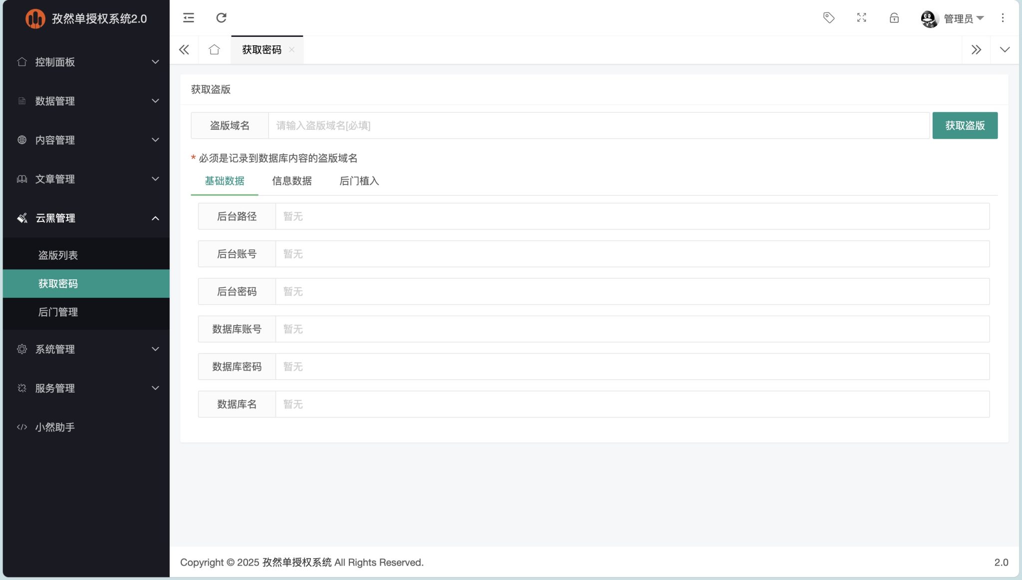 孜然单授权V1.0系统,延续了2022年开发的孜然多应用授权系统V2.0 变更:多应用变单系统,去除没用的垃圾代码,从0开发,去除了一些没用的功能 完善了开发文档,之前那套是我写着玩的屎山代码,V1.0将展示我满满的诚意! 2025.02.18 孜然单授权V2.0 1.优化授权代码和核心代码的逻辑问题 2.更新安装板块的优化