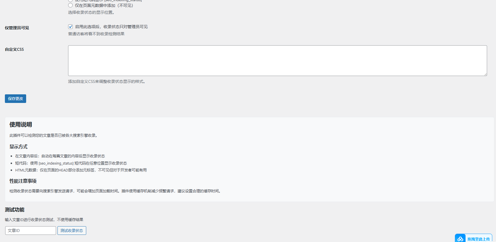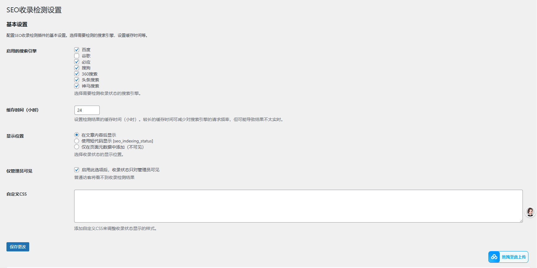 ### 方法一:通过WordPress后台安装 1. 下载插件ZIP压缩包 2. 登录WordPress管理后台,进入”插件” > “安装插件” 3. 点击”上传插件”,选择下载的ZIP文件 4. 上传完成后点击”现在安装” 5. 安装成功后点击”启用插件” ### 方法二:通过FTP安装 1. 下载并解压插件ZIP压缩包 2. 通过FTP客户端连接到您的网站服务器 3. 将解压后的文件夹上传到`/wp-content/plugins/`目录 4. 登录WordPress后台,进入”插件”页面 5. 找到”SEO收录检测”插件并点击”启用” ## 使用指南 ### 基本配置 1. 在WordPress后台导航至”设置” > “SEO收录检测” 2. 在设置页面中: – 选择需要检测的搜索引擎 – 设置缓存时间(1-168小时) – 选择显示位置 – 设置是否仅对管理员显示 – 可选:添加自定义CSS样式 3. 点击”保存更改”按钮应用设置
