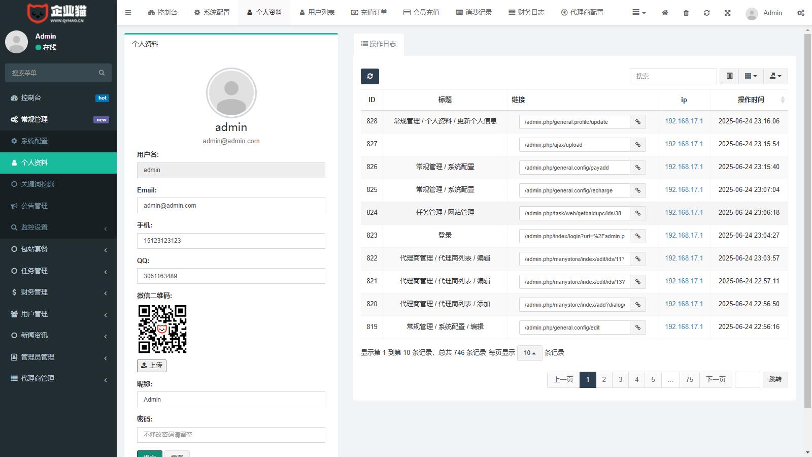 但仍然没找到代理后台的登录页面是那个,测试了下,各页面均为正常打开,微信支付也可以出现二维码,但由于企业猫是在本地测试的,回调不了,所以未能测试完整。