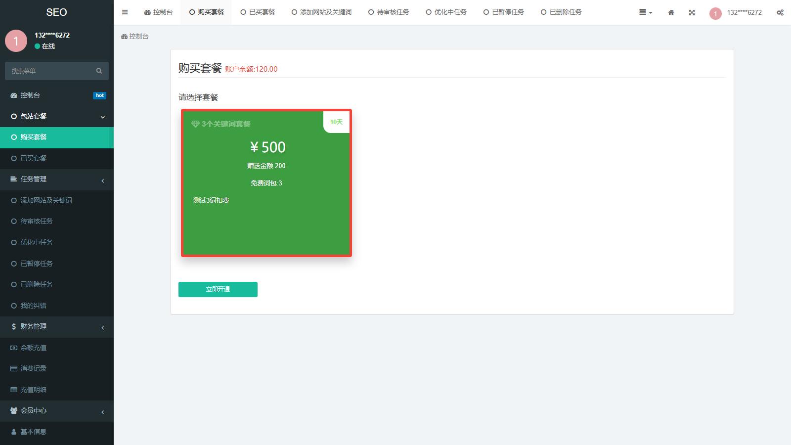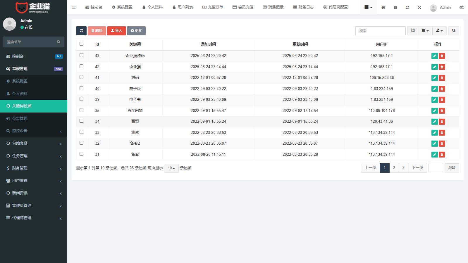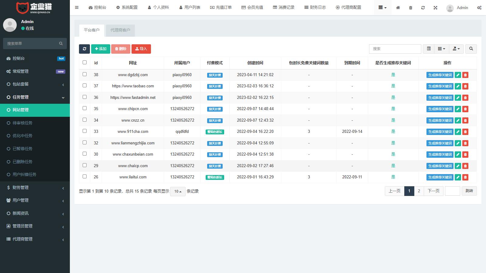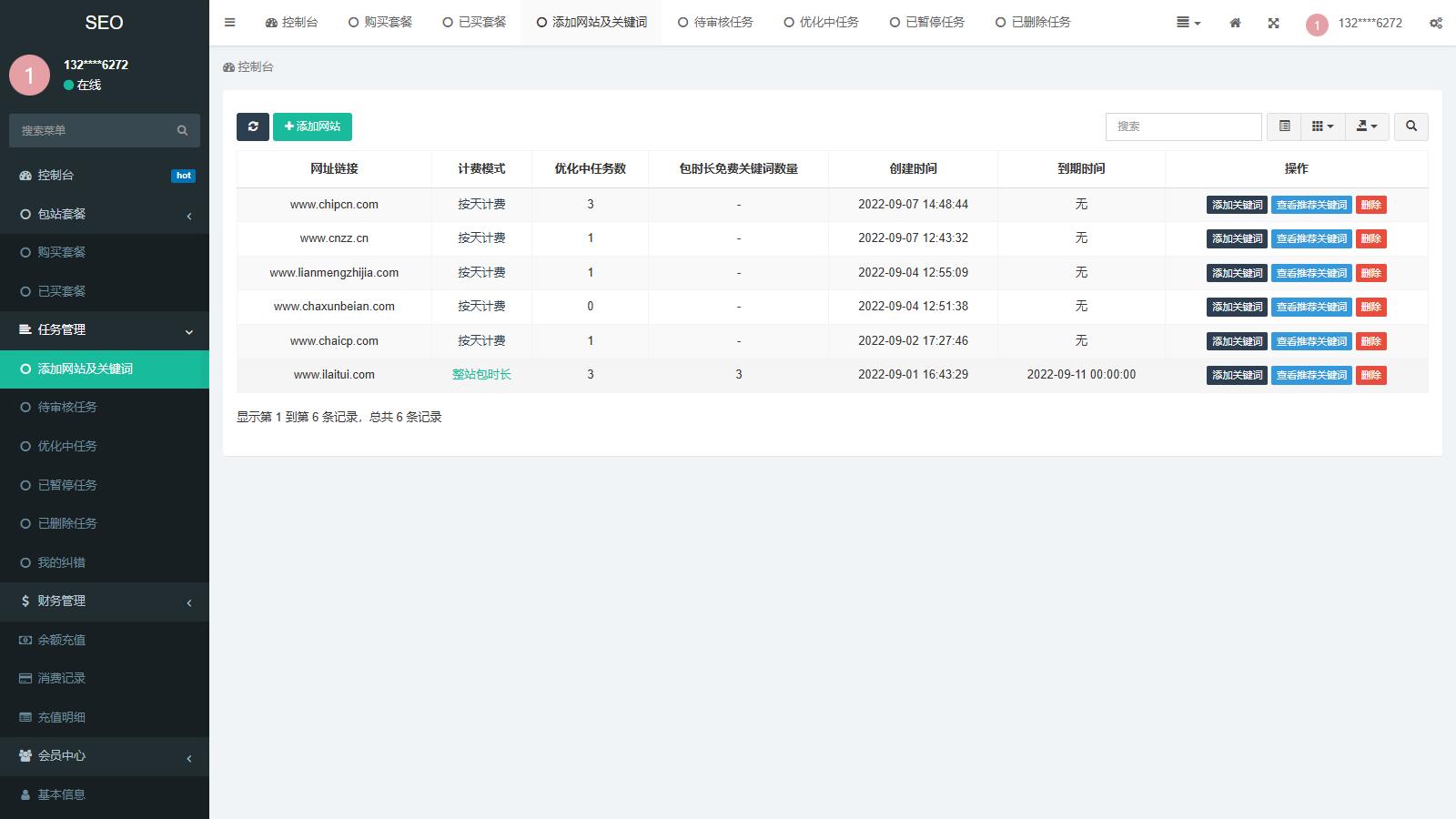 5、结算争议一键纠正;OEM代理独立支付;关键词消费直观、实时记录;独立公告;短信通知;独立客服;自动中止任务;可视化的数据统计