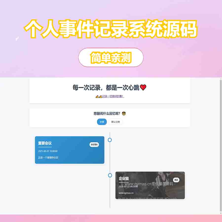 源码介绍: 自适应手机电脑端,可以用来记录生活日常,支持设置事件分类,带后台 安装教程: 源码截图: 声明:本站所有文章,如无特殊说明或标注,均为本站原创发布。任何个人或组织,在未征得本站同意时,禁止复制、盗用、采集、发布本站内容到任何网站、书籍等各类媒体平台。如若本站内容侵犯了原著者的合法权益,可联系我们进行处理。