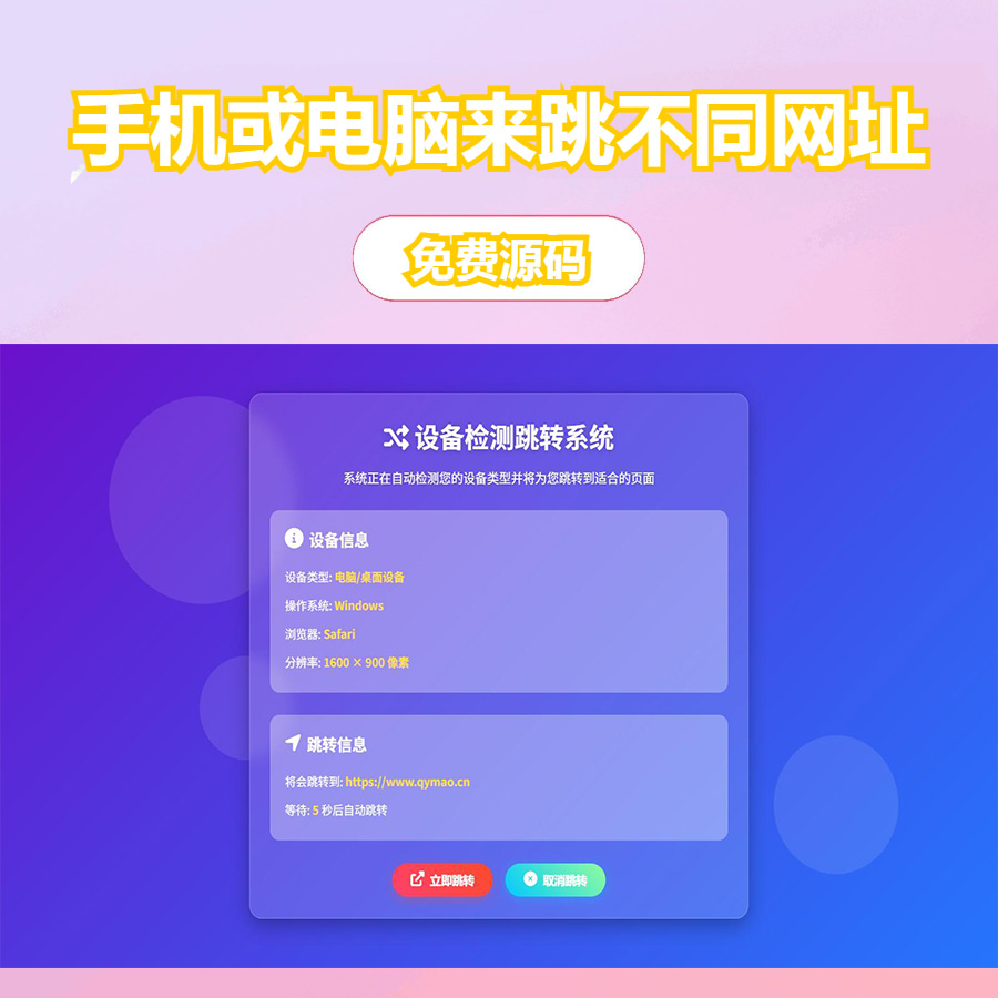 源码介绍: 检测设备手机或电脑来跳转不同网页HTML源码 自适应手机端 源码截图: 声明:本站所有文章,如无特殊说明或标注,均为本站原创发布。任何个人或组织,在未征得本站同意时,禁止复制、盗用、采集、发布本站内容到任何网站、书籍等各类媒体平台。如若本站内容侵犯了原著者的合法权益,可联系我们进行处理。