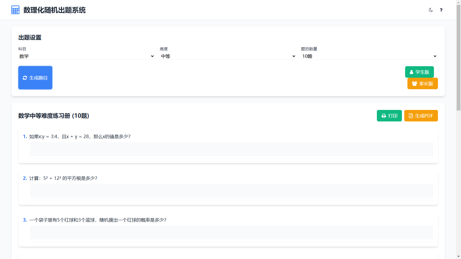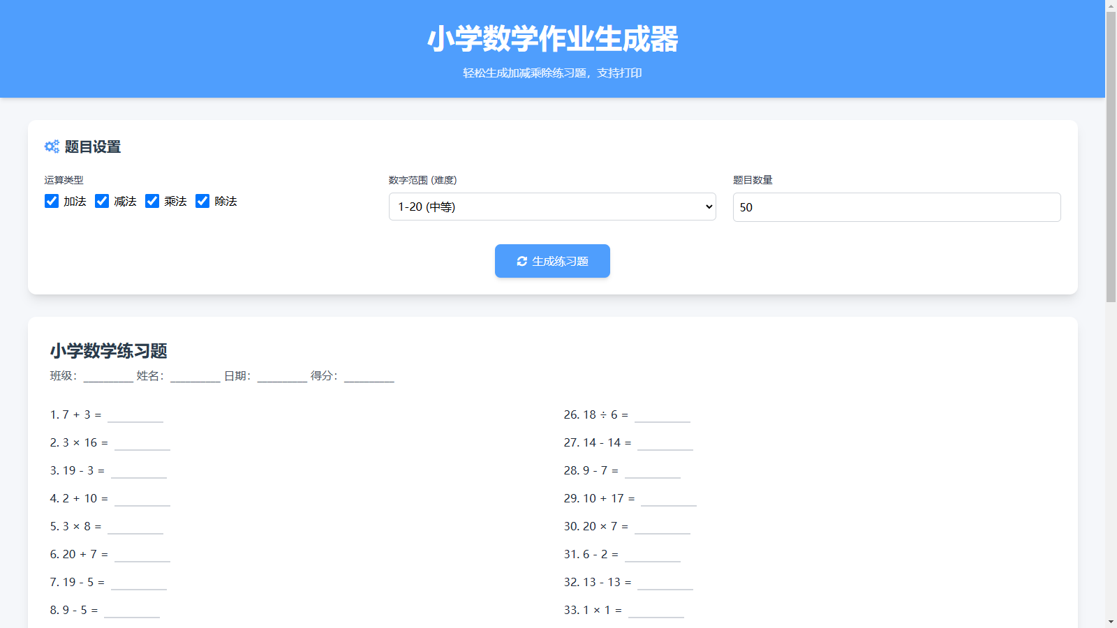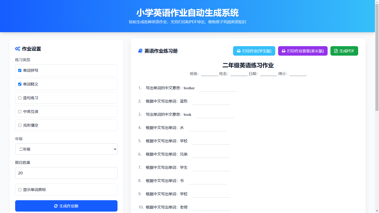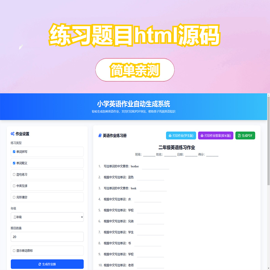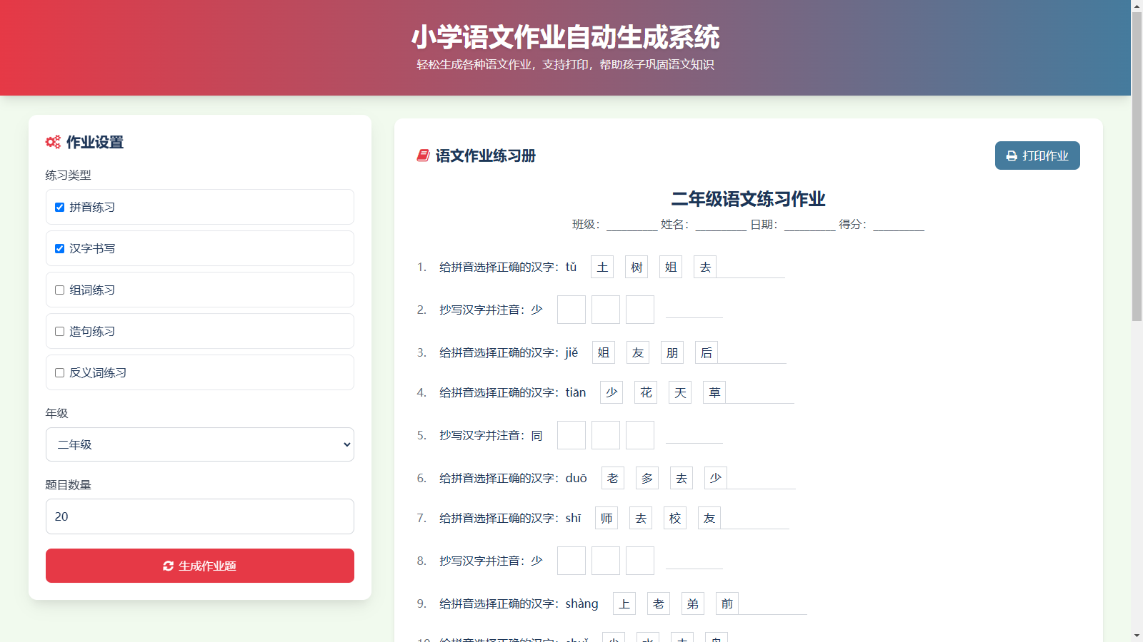这款模板是专注于小学语文作业的出题网站,界面简洁易用,支持随机成各种语文/数学/英语/数理化练习题目,支持打印功能,并在底部添加了指定的版权信息和防篡改措施。
