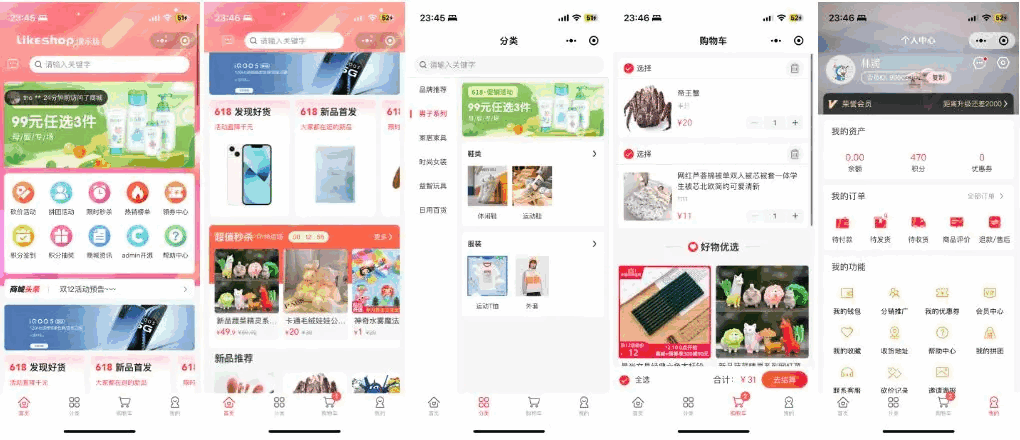 likeshop单商户商城系统包含分销裂变,限时秒杀,拼团活动,砍价活动,优惠券,大转盘抽奖,每日签到,小票打印,积分商城,会员价,微信零钱到账,系统通知/短信通知/APP推送/微信模板消息/小程序消息提醒等常用丰富的营销模块。
