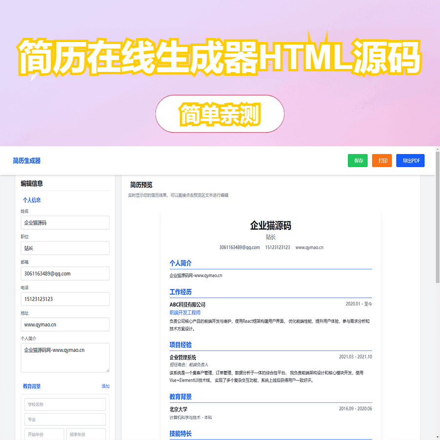 使用时,只需填写各项信息,即可实时生成专业简历,并根据需要导出为 PDF 或直接打印。