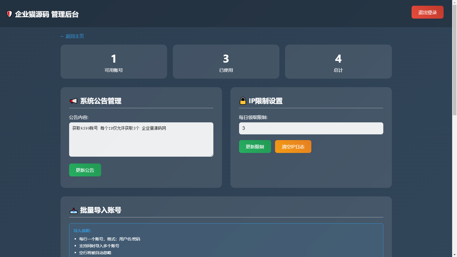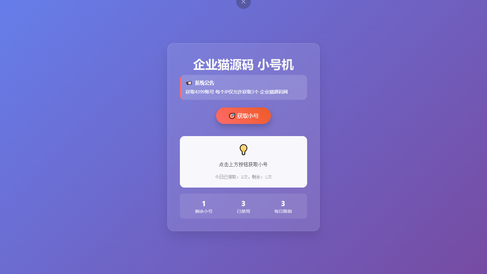 此为小号分发卡密系统源码,专用于分发小号库存账号或卡密等使用,不过规定每个IP仅能领取3次,也可视作小号分发工具。