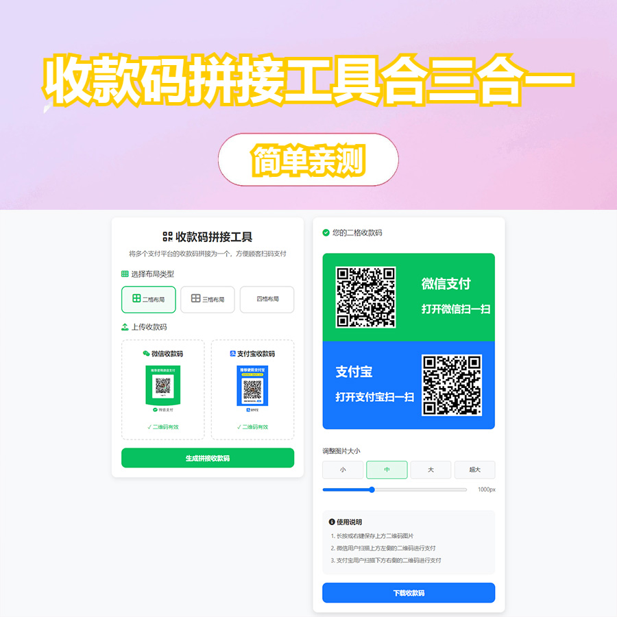 上传相应二维码,然后点生成,在右侧就可拼接出我们需要的二维码。