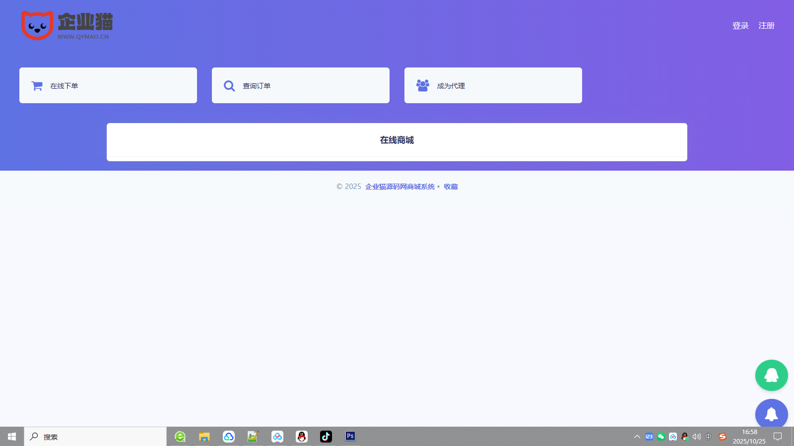 源码介绍: 企业猫搭建了下,可以正常搭建出来, 安装教程: 详细安装教程在http://www.71jc.cn/9061.html 源码截图: 声明:本站所有文章,如无特殊说明或标注,均为本站原创发布。任何个人或组织,在未征得本站同意时,禁止复制、盗用、采集、发布本站内容到任何网站、书籍等各类媒体平台。如若本站内容侵犯了原著者的合法权益,可联系我们进行处理。