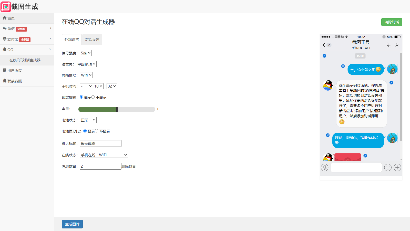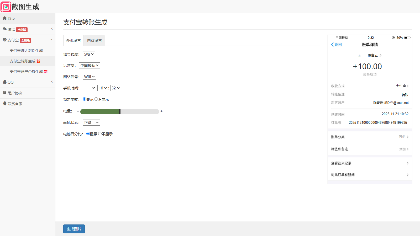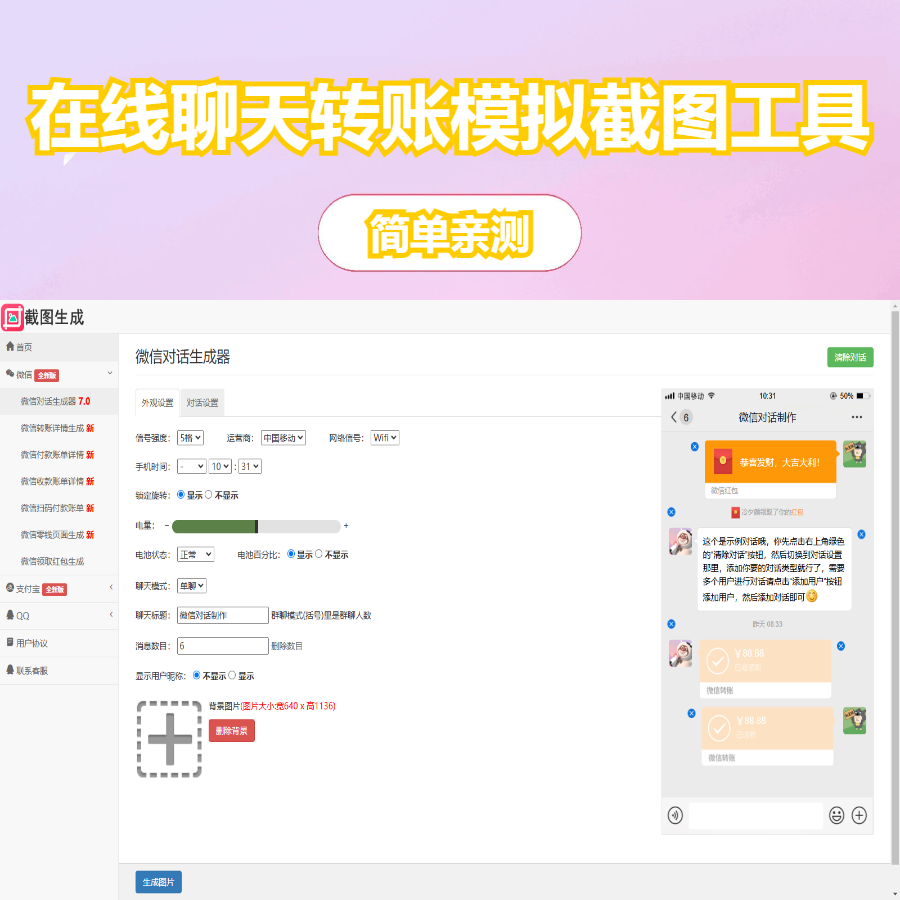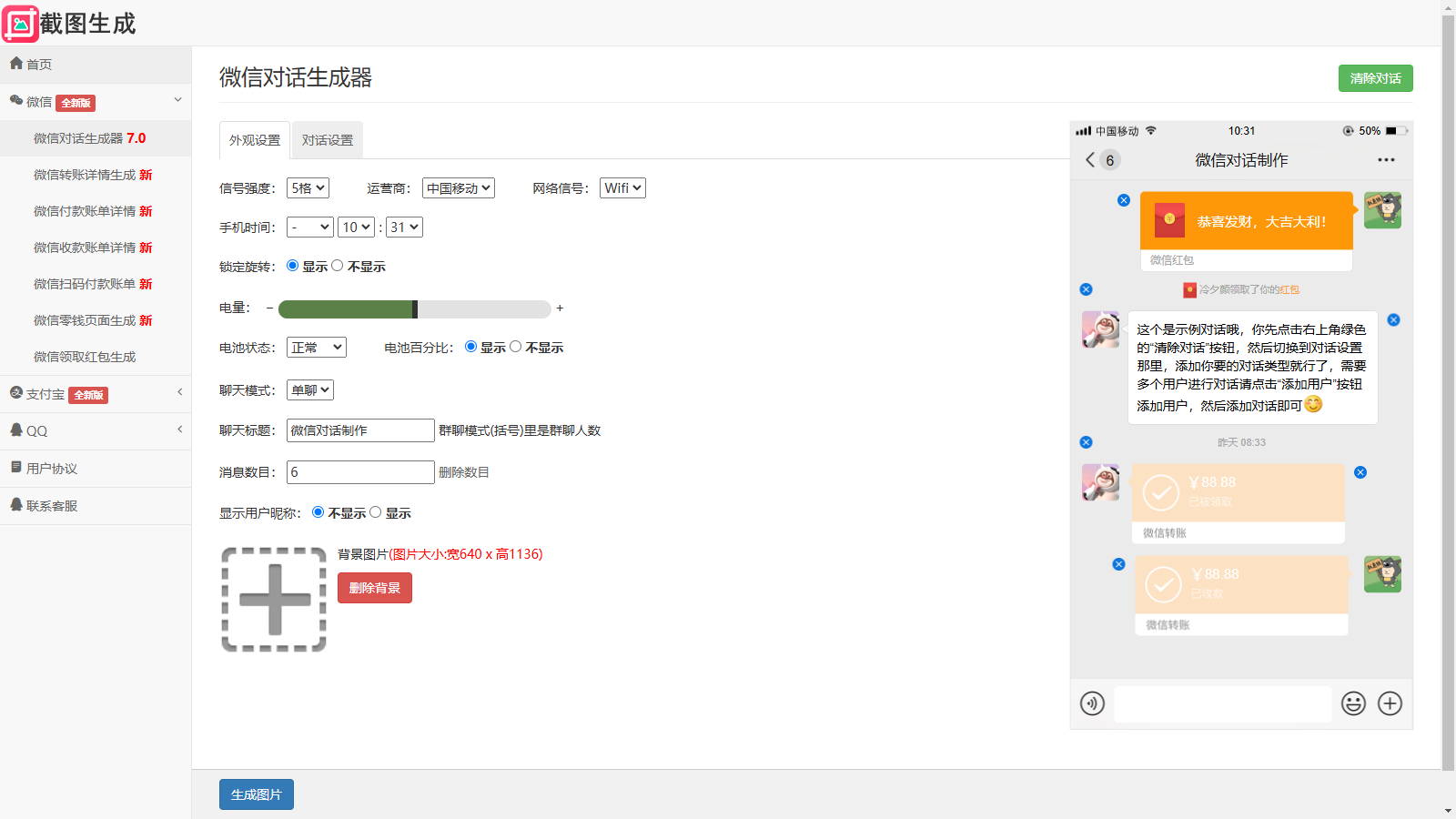 包含生成功能:微信对话、微信领取红包、微信付款详情、微信收款详情、微信转账详情、微信零钱页面详情、微信扫码付款账单、微信对话和红包带安卓设置、微信朋友圈转发详情、支付宝聊天详情、支付宝转账详情、支付宝账户余额详情、淘宝订单详情、QQ聊天详情、手机短信聊天详情!
