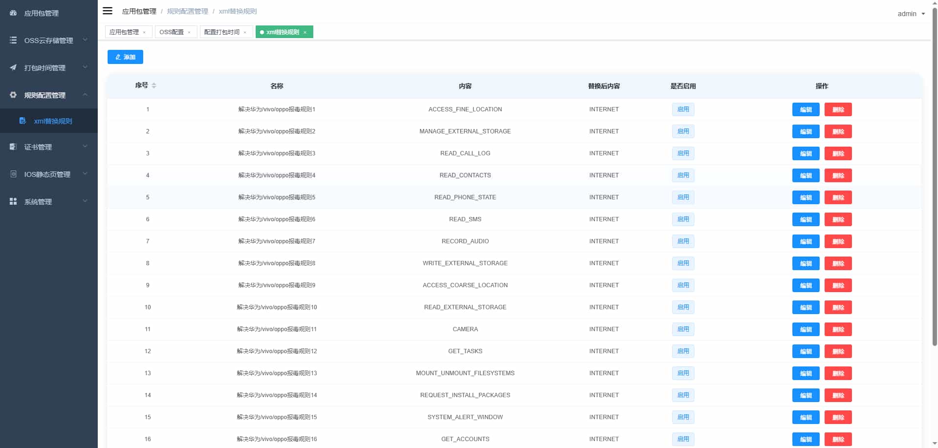 系统通过对apk反编译,随机包名,随机签名,混淆代码等方式,回编译生成新的apk安装包通过系统智能自动处理,间隔5分钟(可以自定义时间)生成一个新包,通过对接对象云储存系统分发给不同的用户下载使用,确保每个用户下载的安装包都是独立的不同的,以此达到免杀的效果!