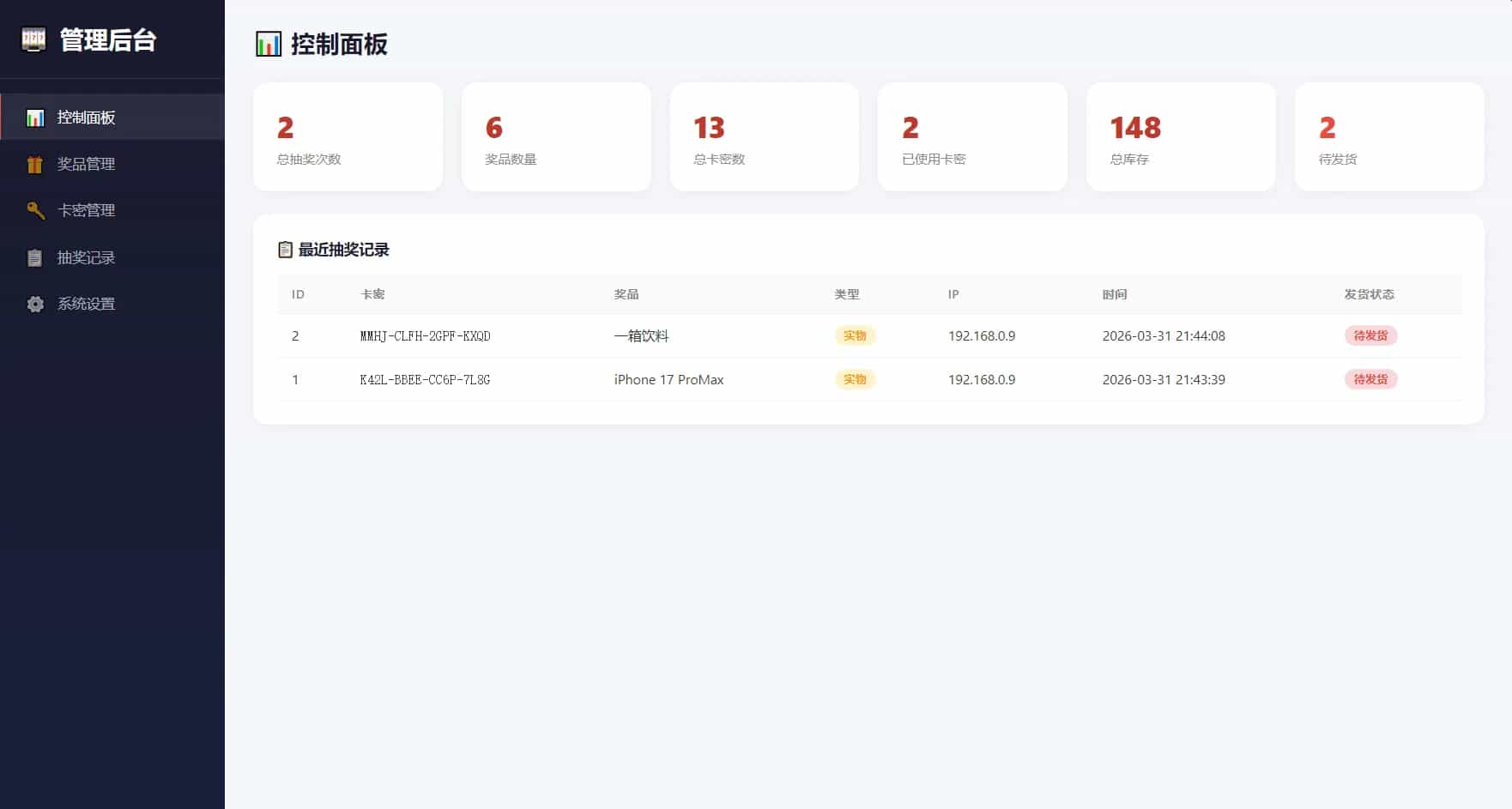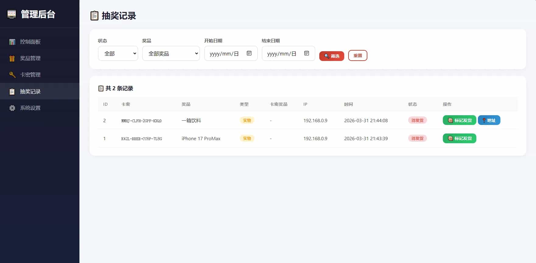 奖品管理** — 支持虚拟卡密奖品和实物奖品
