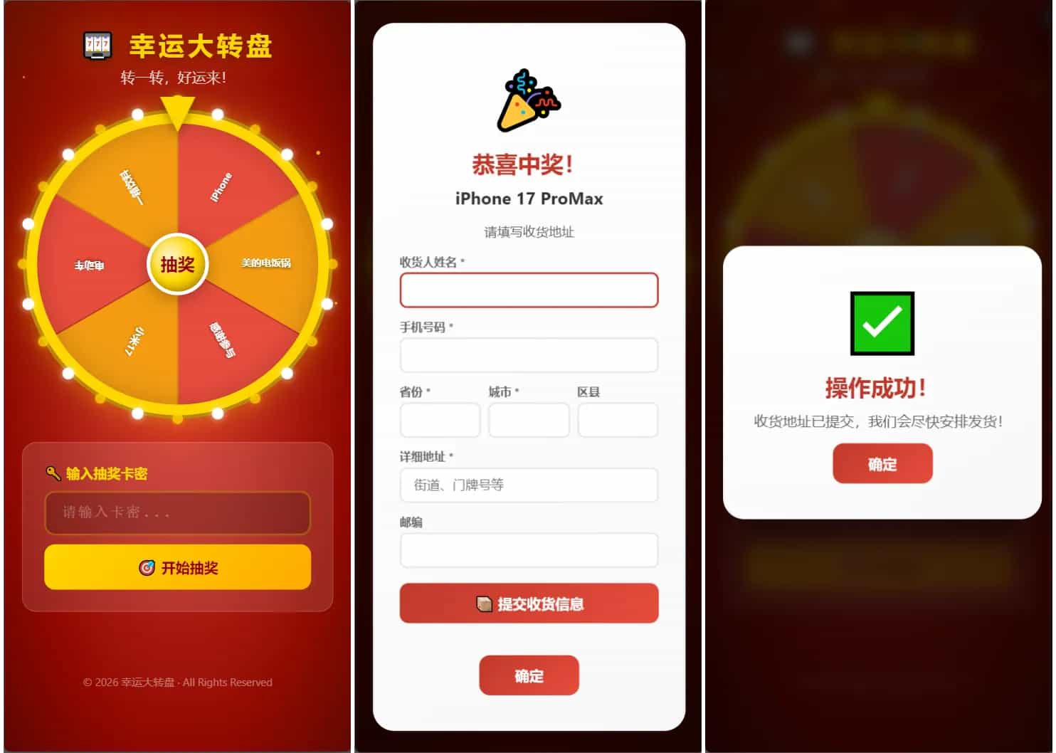 用户在前台输入卡密 → 点击抽奖 → 转盘转动 → 显示结果