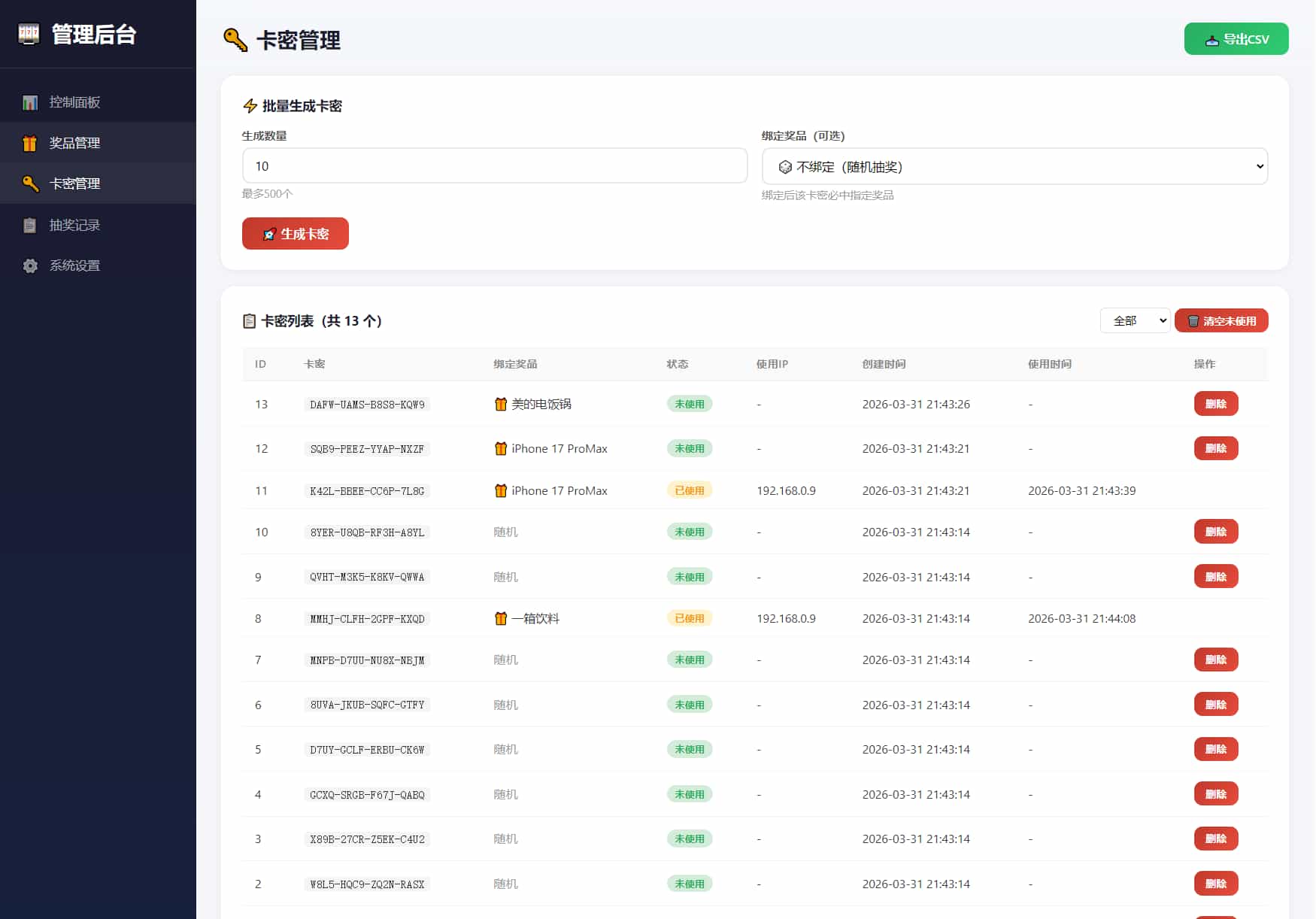 卡密绑定** — 生成卡密时可绑定特定奖品(保证该卡密必中指定奖品)